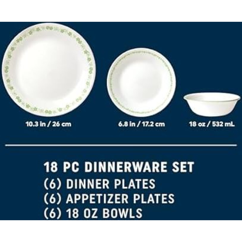 "Corelle Vitrelle" 18 dalių stiklinių pietų servizas 6 asmenims, trijų sluoksnių, atsparus duženoms ir įtrūkimams, stiklinių lėkščių ir dubenų rinkiniai, pavasario žiedų žalia