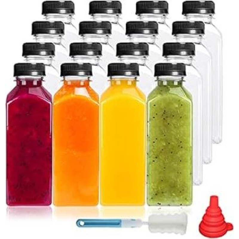 YBCPACK 16 vnt. 350 ml talpos plastikinių sulčių butelių su dangteliu, skirtų mini šaldytuvui, tušti daugkartinio naudojimo buteliai, skirti kokteiliams, sultims ir kitiems gėrimams (juodas dangtelis)