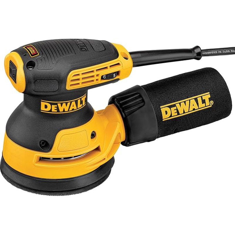 "DeWalt" atsitiktinių orbitų šlifuoklis su įsiurbimo sistema, dulkių gaudykle, dulkių nepraleidžiančiu jungikliu ir pavarų dėžės korpusu - mažos vibracijos šlifuoklis su galingu varikliu - 280 W - 125 mm - DWE6423
