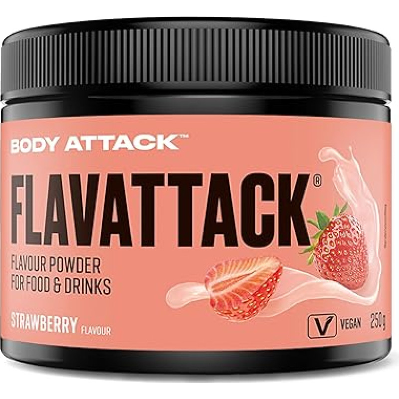 "Body Attack Flavattack Strawberry", 250 g, tik 7 kcal/daliai, intensyvaus skonio milteliai miuzeliams, ryžių pudingams, avižiniams dribsniams, gėrimams ir kt. Skonio milteliai be palmių aliejaus, aspartamo, glitimo.
