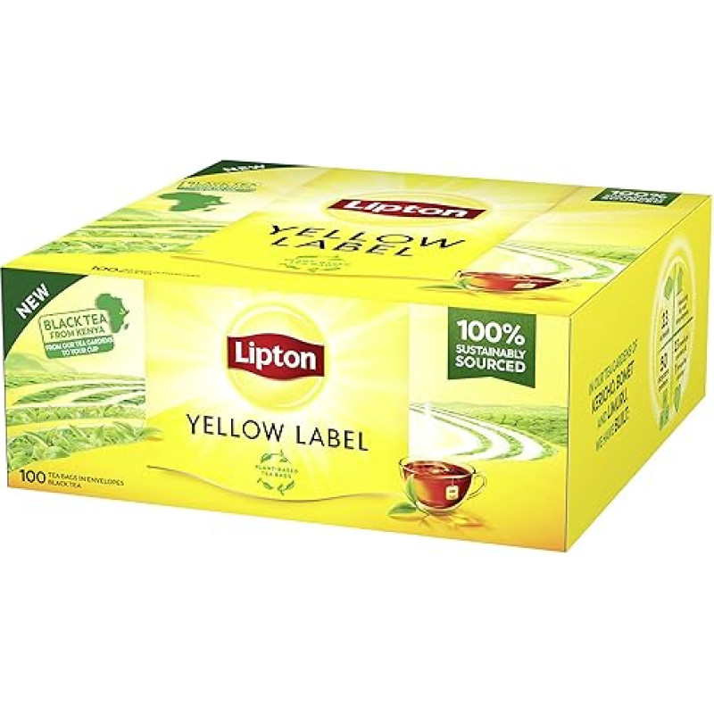 "Lipton Yellow Label" juodoji arbata su rankomis rinktais juodosios arbatos lapais, augalinės kilmės, atskirai supakuoti arbatos maišeliai, sertifikuota "Rainforest Alliance", 100 arbatos maišelių pakuotė