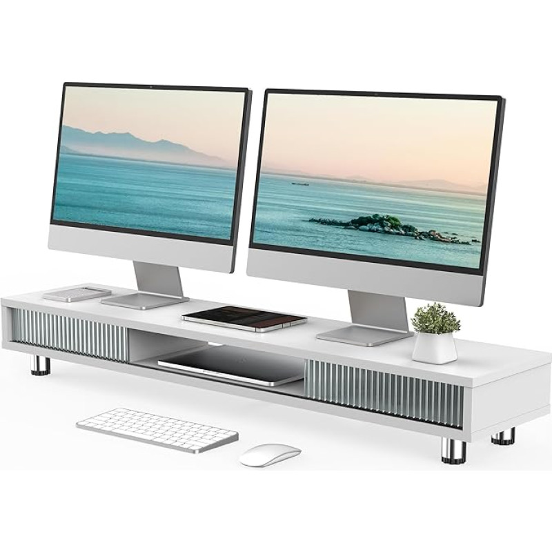 "Fenge" dvigubas monitoriaus stovas 108 cm dideliam ekranui su 2 stiklinėmis stumdomomis durelėmis, reguliuojamo aukščio monitoriaus stovas kompiuteriui / nešiojamajam kompiuteriui / televizoriui, apkrovos talpa 50 kg (baltas)